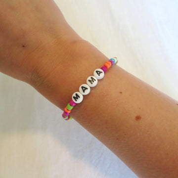 The Custom Name Heishi Bead Bracelet is made with durable stretch cord, 6mm heishi beads,...