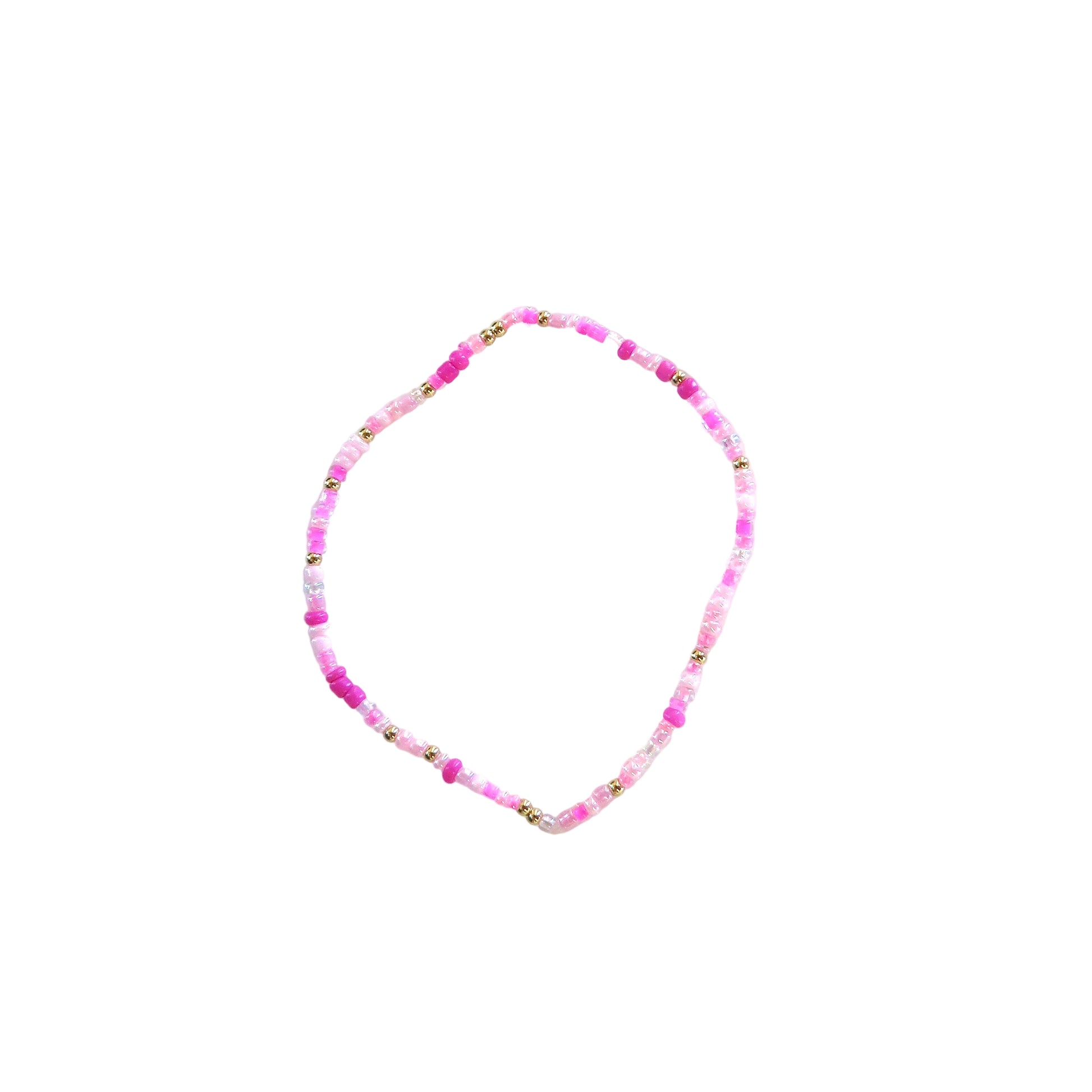A mix of 2mm pink beads and 14k gold filled beads on a stretchy band.