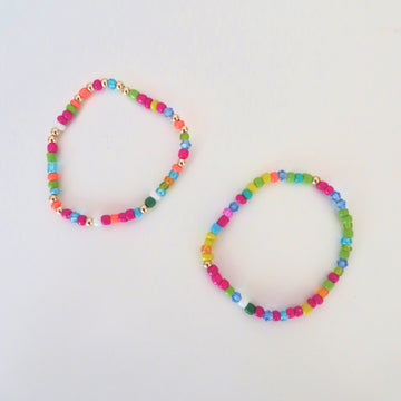 Add a pop of playful color to your stack with this vibrant beaded bracelet. Strung on a comfortable stretch cord, this bracelet features a cheerful mix of 4mm seed beads, accented with 4mm gold-filled beads. Whether worn solo or layered with your favorite pieces, it's the perfect accessory to brighten up any look.